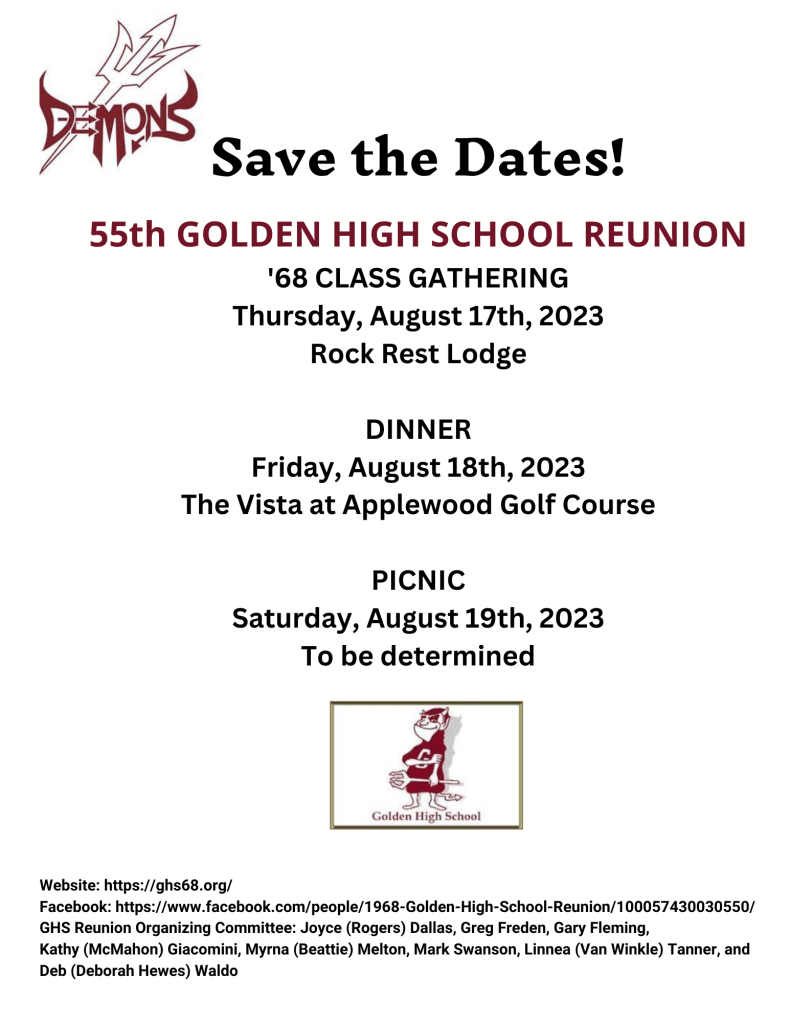 SAVE THE DATES: Aug 17th Gathering (Rock Rest Lodge); Aug 18th Dinner (Vista at Applewood Golf Course); Aug 19th Picnic (Gary Fleming’s house). Notifications for the 55th Reunion of the 1968 Golden High School class have been mailed to classmates. If you have not received any notifications, contact Kathy (McMahon) Giacomini at Kathy.Giacomini@ucsf.edu or Mark Swanson at meswanson@msn.com, providing your updated contact information. Put in the subject header: Updated Contact for ’68 GHS Class Reunion